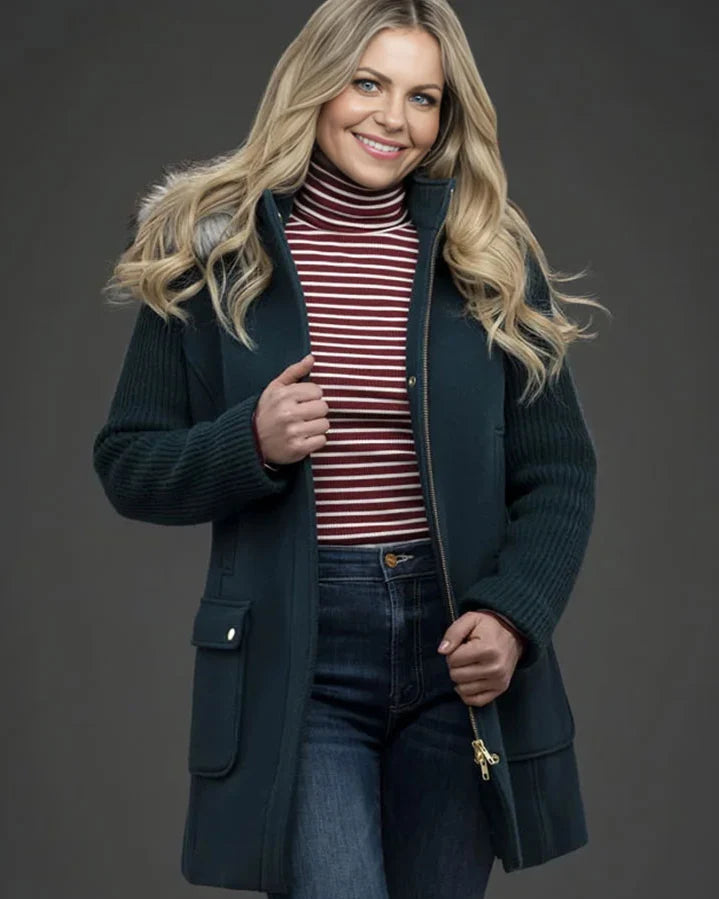 A Christmas Less Traveled Candace Cameron Bure Hooded Blue Coat