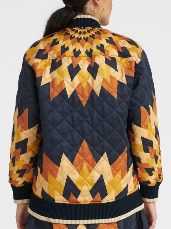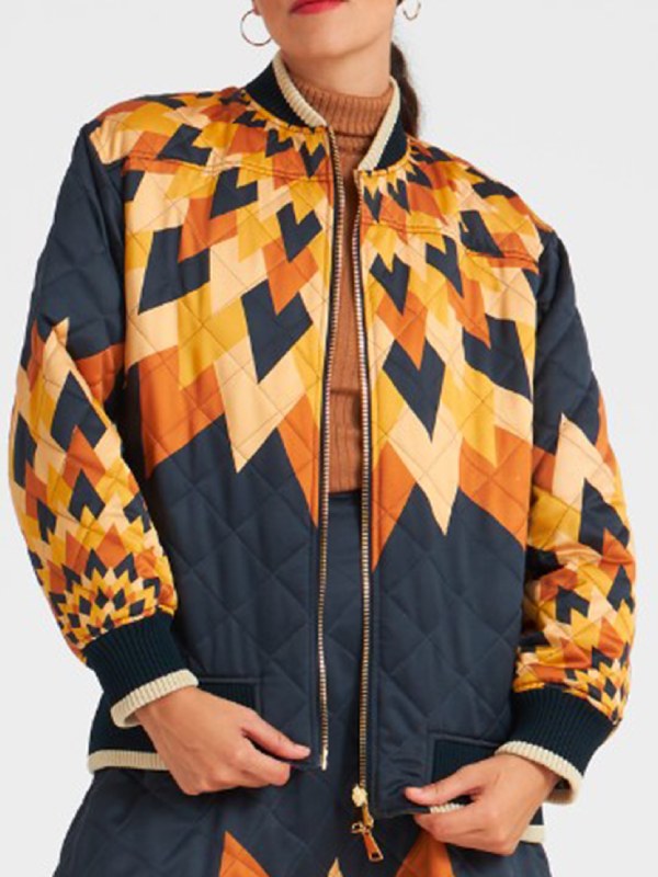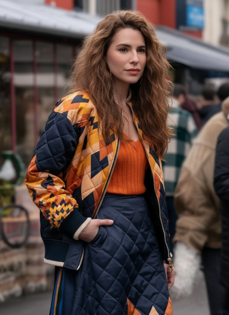 The printed quilted jacket, as worn by Melia Kreiling as Sofia Sideris in Season 4 of Emily in Paris, is a study in innovative design and wearable beauty with aplomb. The multi-colored abstract print is eye-catching and features bold geometric and tribal-inspired motifs. The rich color palette, with deeply saturated navy and warm oranges, yellows, and beige tones, is sophisticated and complex. The intricate surface design, printed onto quilted satin fabric, brings a beautiful sheen and sumptuous texture to the jacket, transforming it from just a functional outerwear piece to a true statement piece.