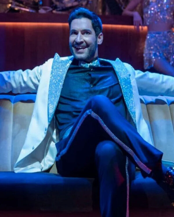 The specific tuxedo from the final season—featuring the white jacket with silver sequined lapels—represents a departure from his usual “Devil in a dark suit” aesthetic. This look leans into the glamour of Old Hollywood and showmanship, perfectly suited for his performances at Lux. The contrast between the stark white wool of the coat and the shimmering glitter of the lapels captures his dual nature: he is both a creature of light (the Morningstar) and a flamboyant entertainer. By pairing it with a black shirt and trousers accented by a matching silver side-stripe, the outfit maintains a modern, edgy vibe while remaining impeccably formal.