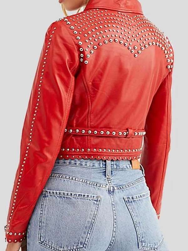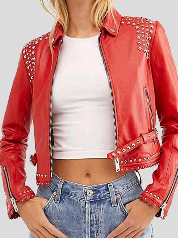Studded Style Cropped Red Leather Jacket For Women?s
