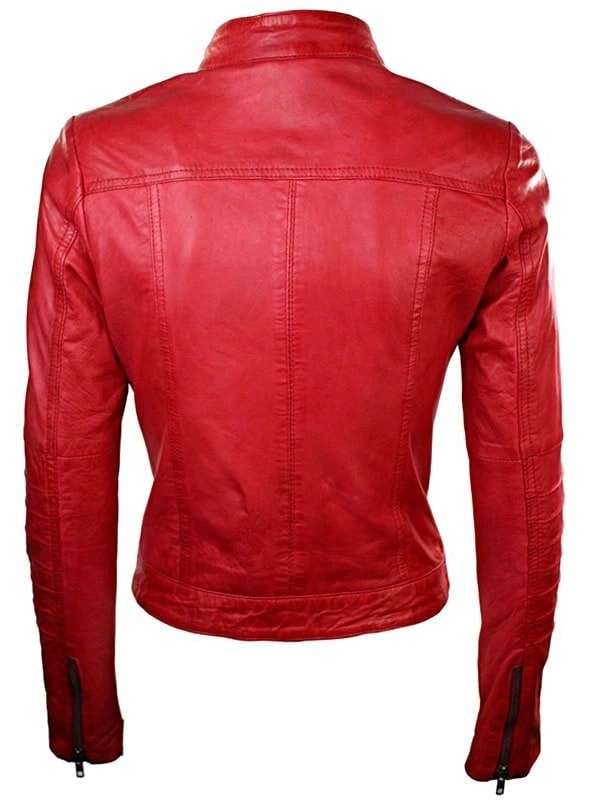 Product Specification:External Material: Faux / Sheepskin LeatherInner Lining: Viscose LiningFront: Zipper ClosureCollar: Stand-Up CollarColor: RedPockets: Four at Front and One InsideSleeves: Full length Sleeves with Zipper Cuffs