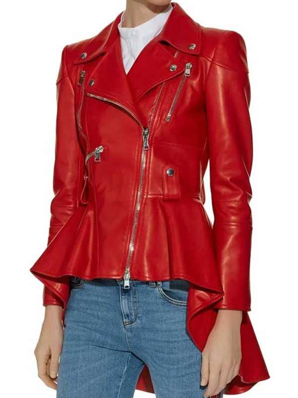 Product Specification:External Material: Real LeatherInner Lining: Viscose LiningFront: Zipper ClosureCollar: Lapel CollarColor: RedPockets: Two at Front and One InsideSleeves: Full length Sleeves with Zipper Cuffs